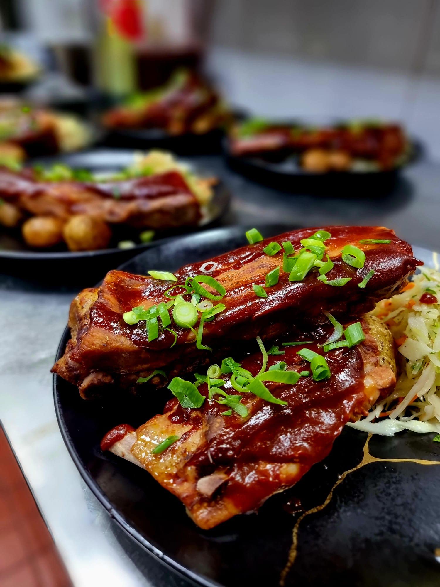 Podane z pieczonymi ziemniakami, surówką z białej kapusty oraz sosem bbq